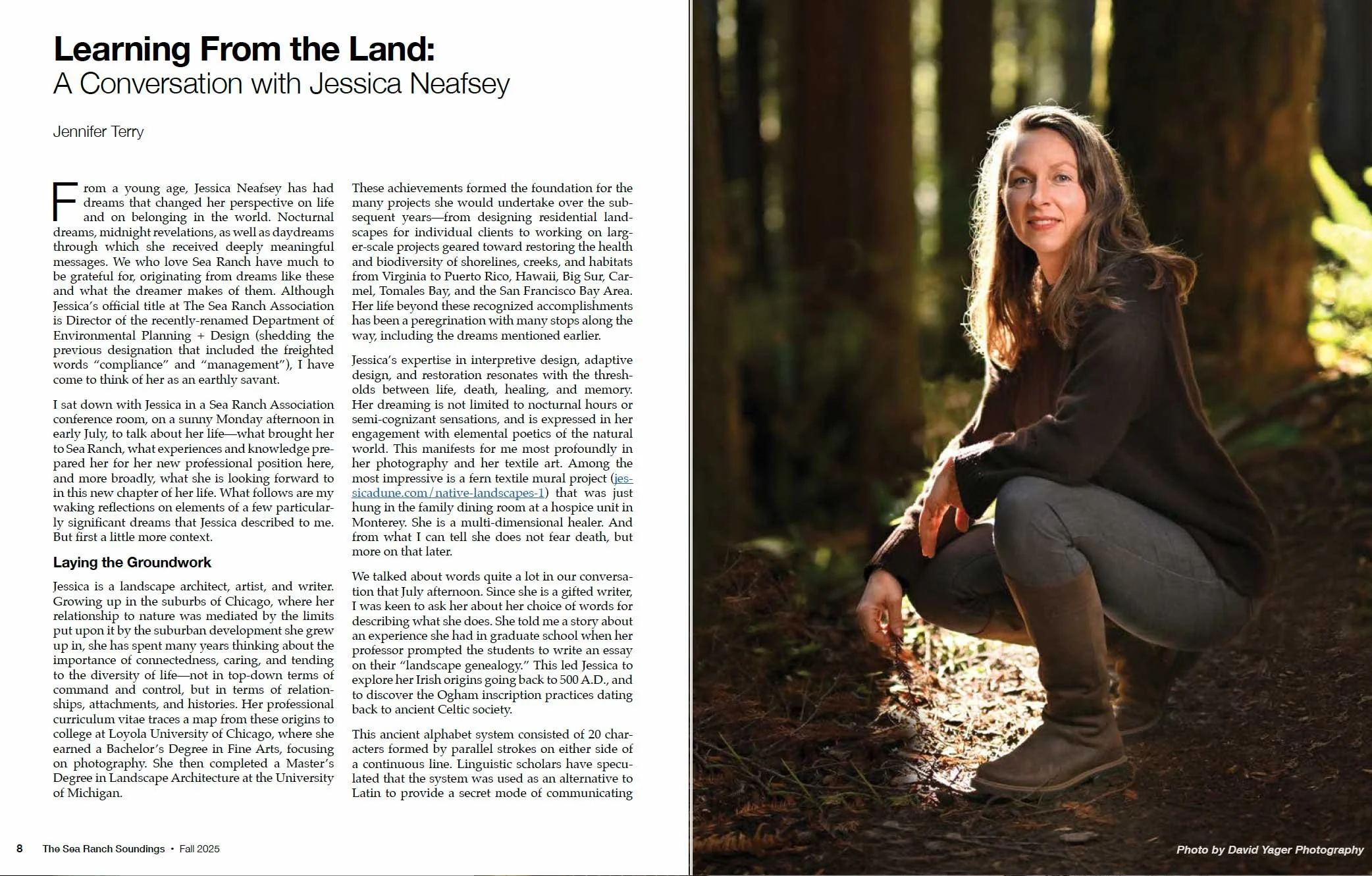 "Learning From the Land: A Conversation with Jessica Neafsey" Sea Ranch Soundings Fall 2025 by Jennifer Terry, Photography by David Yaeger